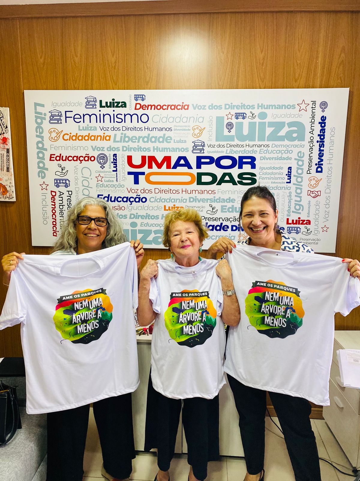 Na foto: Maria Rosana Gama, Iara Penteado e Luiza Ribeiro com camiseta do bloco.
