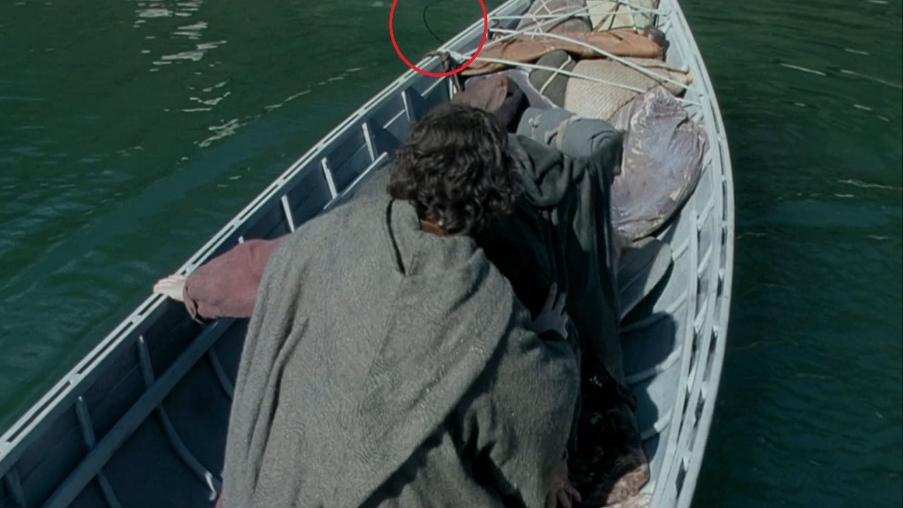 Mas, existem alguns pequenos momentos da saga que podem nos tirar da magia da Terra Média e que, depois de vê-los, não conseguiremos deixar para lá. Por exemplo, em A Sociedade do Anel, mais especificamente em 2:47:09, quando o navio de Frodo está partindo, podemos ver pendurada uma das cordas que o amarravam ao porto (ou talvez um cabo elétrico?).