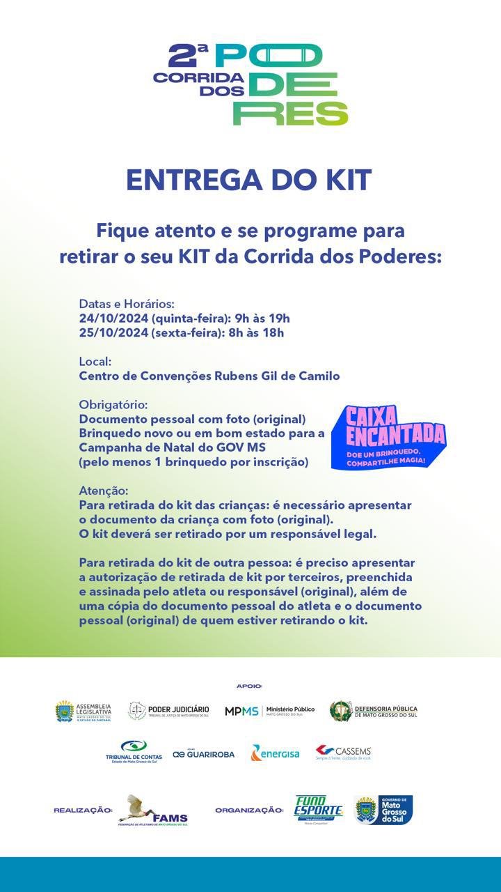 A Corrida dos Poderes será realizada no dia 26 de outubro, com percursos de 3Km (caminhada) e corridas de 5Km e 10Km, além da Corrida Kids. O evento começa às 15h00, com a abertura da Arena em frente da ALEMS. Às 16h está prevista a Corrida Kids. Às 17h10 a Largada Pernas Solidária e às 17h15 as largadas das corrida 5 km e 10 km. A largada da caminhada será na sequência, às 17h20. A partir das 18h estão previstos shows culturais. Confira a programação completa acessando aqui.