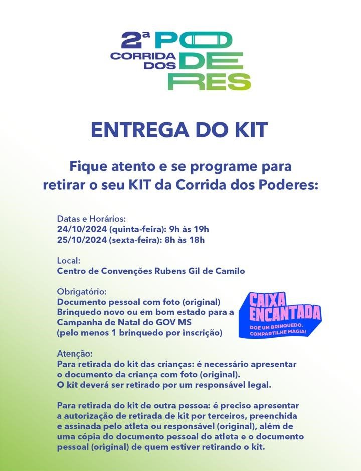 Para retirada do kit por terceiros, é preciso apresentar autorização, preenchida e assinada pelo atleta, além de cópias dos documentos pessoais do inscrito e de quem estiver retirando. Detalhes adicionais sobre o evento de 2024 estão disponíveis no site https://corridadospoderes.ms.gov.br.