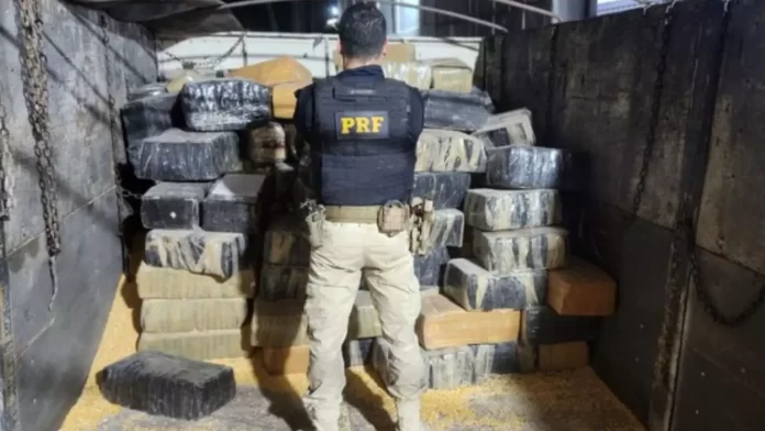 O caminhão e o casal foram conduzidos para a Unidade Operacional da PRF, onde foram encontrados 3,360 toneladas de maconha escondidos em meio à carga de milho.