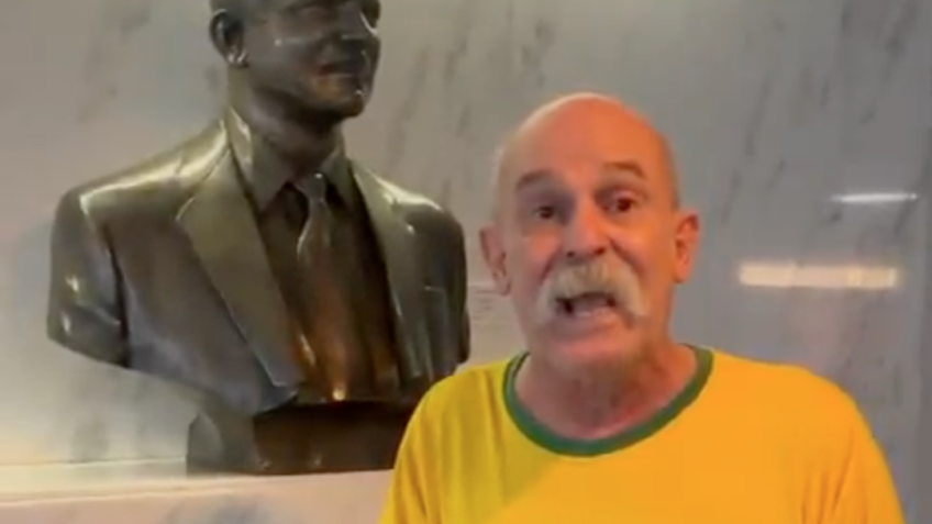 Fahur gravou o vídeo em frente ao busto em homenagem ao ex-deputado federal Rubens Paiva (1929-1971) na Câmara. O congressista foi cassado, torturado e morto durante a ditadura militar no Brasil.
