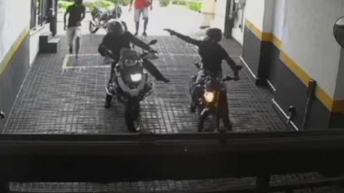 Nas imagens, é possível ver que a vítima foi abordada por 1 criminoso armado assim que abriu o portão do edifício. Logo em seguida, outra moto com duas pessoas se aproximou. Os 3 assaltantes cercaram o motociclista dentro da garagem e o forçaram a descer do veículo, levando também seu capacete e outros pertences.