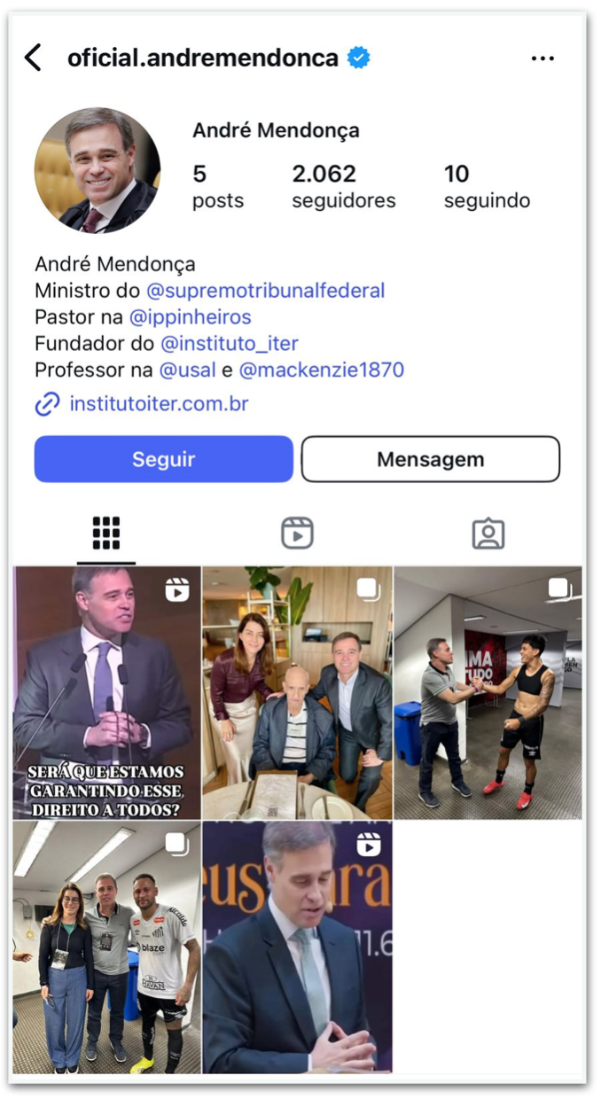 O ministro do STF (Supremo Tribunal Federal) André Mendonça criou um perfil no Instagram no final de março, tornando-se o 6º integrante do Supremo a utilizar a plataforma. Até esta 4ª feira (16.abr.2025), acumulava 5 publicações e 2.010 seguidores.