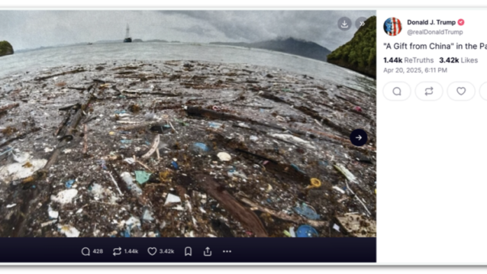 O presidente dos Estados Unidos, Donald Trump (Partido Republicano), postou neste domingo (20.abr.2025) 3 fotos de lixo acumulado no oceano Pacífico com a legenda: “Um presente da China!”. A publicação foi feita em seu perfil na rede Truth Social.