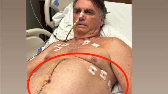 O ex-presidente Jair Bolsonaro (PL) publicou neste domingo (20.abr.2025), em seu perfil no X, foto em que mostra como ficou o corte da cirurgia abdominal pela qual passou em 13 de abril por causa de complicações da facada que sofreu em 2018. É possível ver os pontos na barriga do ex-chefe do Executivo e um dreno próximo do local.