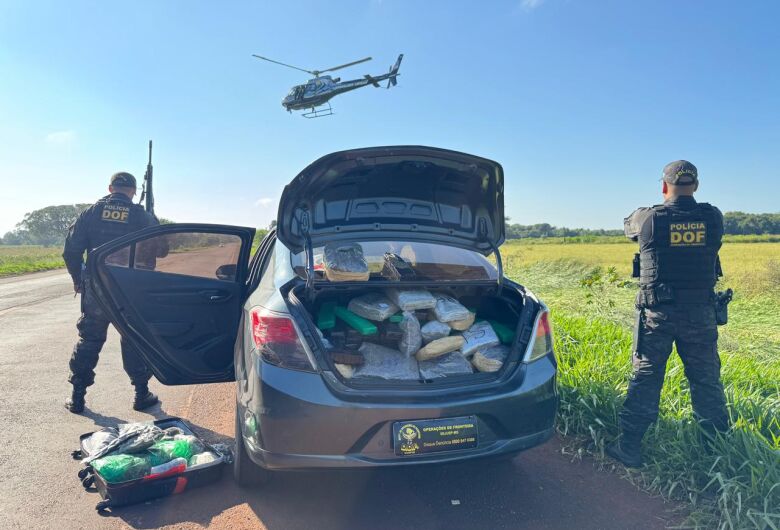 Após a troca de informações entre as duas unidades, policiais do DOF com apoio do helicóptero da unidade de policiais da CGPA (Coordenadoria Geral de Policiamento Aéreo) interceptaram o veículo no Anel Viário, próximo a reserva indígena, com as drogas e os dois ocupantes.