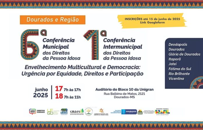 Dourados realiza nos dias 17 e 18 de junho a 6ª Conferência Municipal dos Direitos da Pessoa Idosa, que terá pela primeira vez uma dimensão intermunicipal, com a 1ª Conferência Intermunicipal dos Direitos da Pessoa Idosa, reunindo representantes das cidades de Deodápolis, Glória de Dourados, Jateí, Fátima do Sul, Itaporã, Rio Brilhante e Vicentina. O evento, com inscrições abertas, será realizado no auditório do Bloco 10 da Unigran.