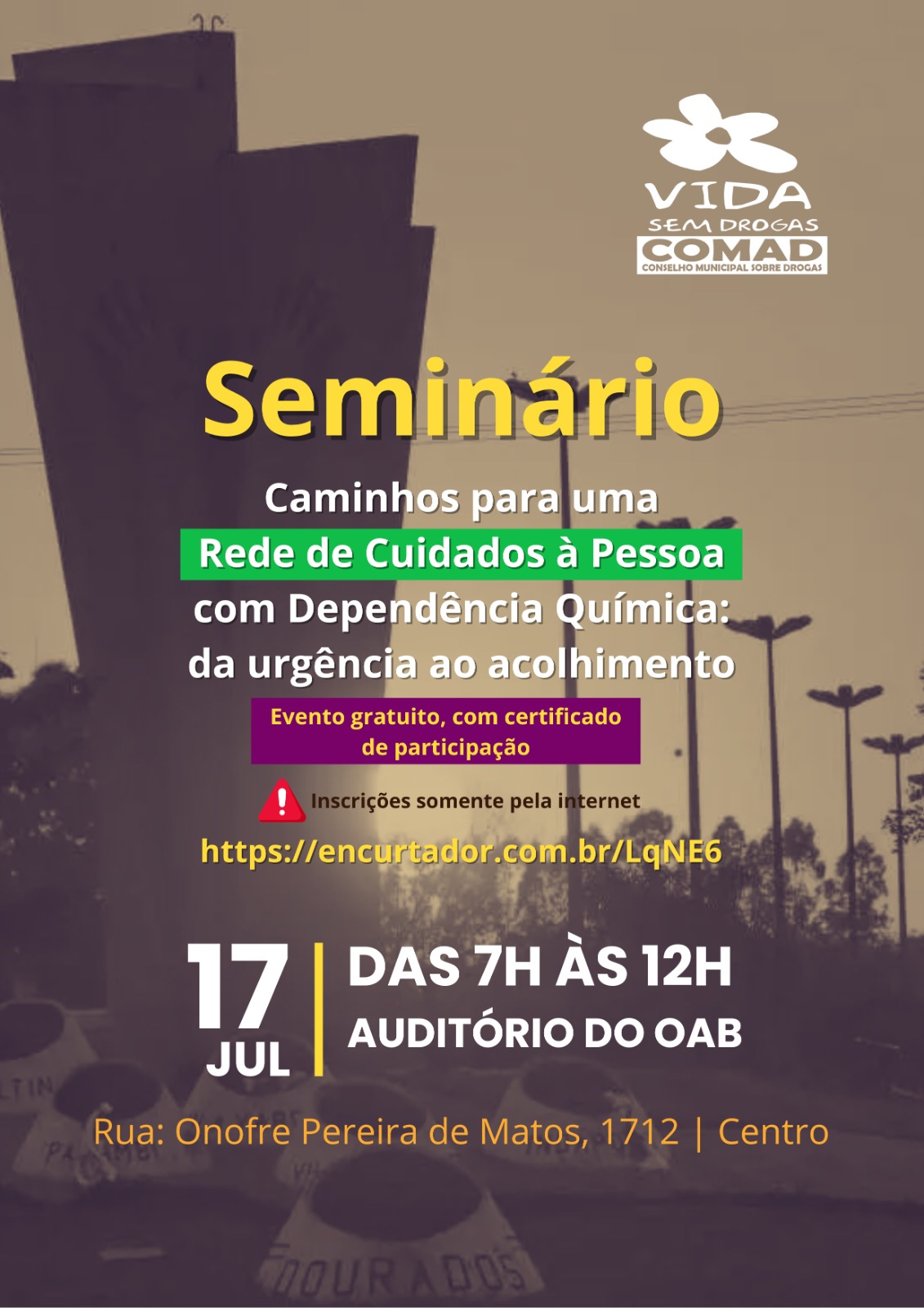 O Conselho Municipal de Políticas sobre Drogas (Comad) de Dourados encerra hoje – 15 de julho – as inscrições para o seminário “Caminhos para uma Rede de Cuidados à Pessoa com Dependência Química: Da Urgência ao Acolhimento”, que acontecerá na quinta-feira, dia 17, das 7h às 12h, no auditório da OAB (Rua Onofre Pereira de Matos, 1712 – Centro). O evento é gratuito e voltado a profissionais da saúde, assistência social, educação, autoridades, estudantes e demais interessados na temática.