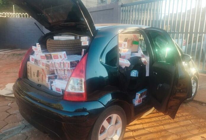 Durante inspeção veicular, foram localizadas diversas mercadorias de origem estrangeira, entre elas uma expressiva quantidade de cigarros paraguaios, duas bolas de pneus, óculos e cigarros eletrônicos, todos desacompanhados de documentação fiscal ou aduaneira. A importação e comercialização desses produtos são proibidas no Brasil.