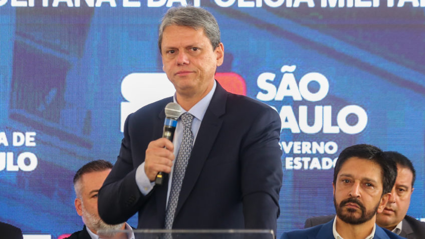 Tarcísio participou da cerimônia de entrega das 100 primeiras câmeras do programa Smart Sampa, ao lado do prefeito de São Paulo, Ricardo Nunes (MDB). Os equipamentos foram instalados em motos da GCM (Guarda Civil Metropolitana) e da Polícia Militar.