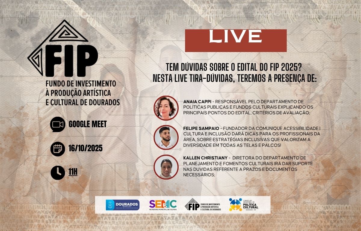 A Prefeitura de Dourados, por meio da Secretaria Municipal de Cultura, realiza nesta quinta-feira (16) uma live especial para esclarecer dúvidas sobre o edital do Fundo Municipal de Investimentos à Produção Artística e Cultural (FIP). O encontro on-line tem o objetivo de orientar artistas, produtores e agentes culturais sobre as etapas de inscrição, critérios de avaliação e documentação necessária para participar da seleção.