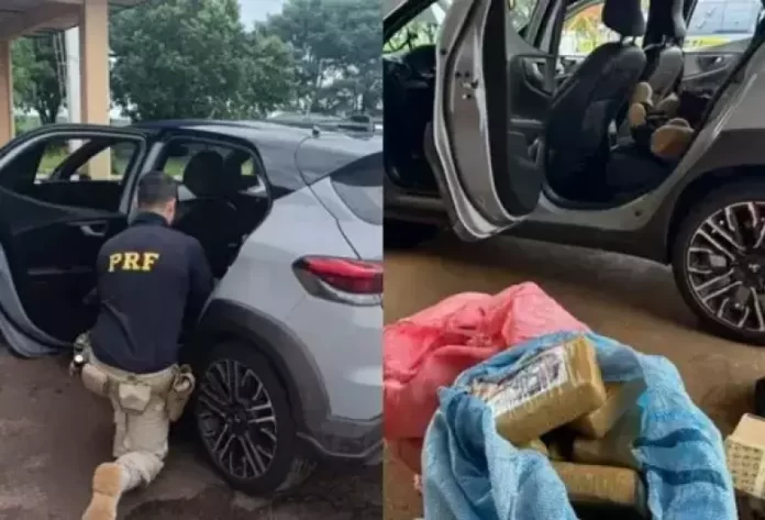 Em vistoria detalhada, foram encontrados 63,1 quilos de maconha e 9,4 quilos de skunk, escondidos no assoalho traseiro e no porta-malas do carro. No veículo também estava um passageiro, que afirmou saber da existência da droga e disse que receberia pagamento para acompanhar o transporte.