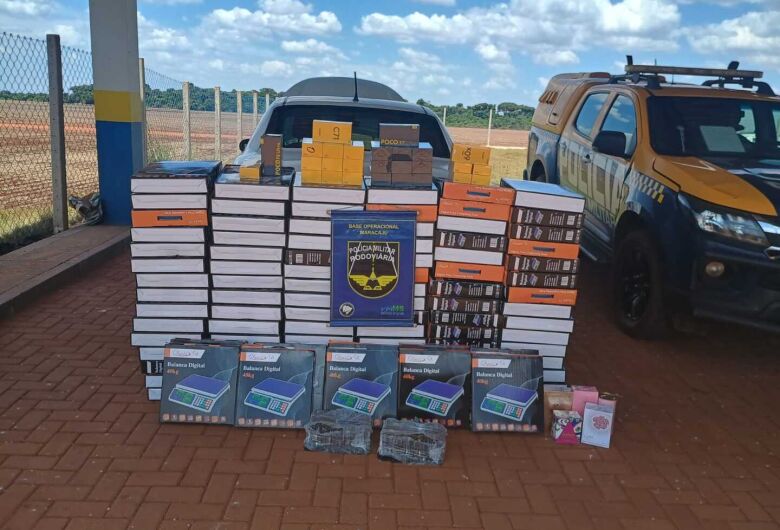 Poucos minutos depois, por volta das 12h15, a equipe abordou um veículo Fiat Siena, com placas de Curitiba (PR), conduzido por um homem de 51 anos. No interior do veículo foram encontrados 200 baterias para celular, 100 balanças digitais, 27 aparelhos celulares de diferentes modelos e 5 perfumes de marcas diversas, também sem documentação fiscal.