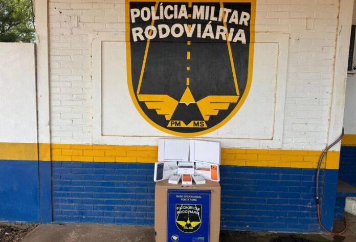Na busca, os policiais encontraram, no interior de malas e mochilas, 27 aparelhos celulares da marca Apple, modelos iPhone 17 Pro e iPhone 17 Pro Max, além de dois notebooks MacBook Air, todos sem documentação fiscal.