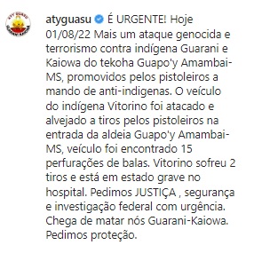 “Pedimos justiça, segurança e investigação federal com urgência. Chega de matar nós Guarani-Kaiowa. Pedimos proteção”, conclui a nota: