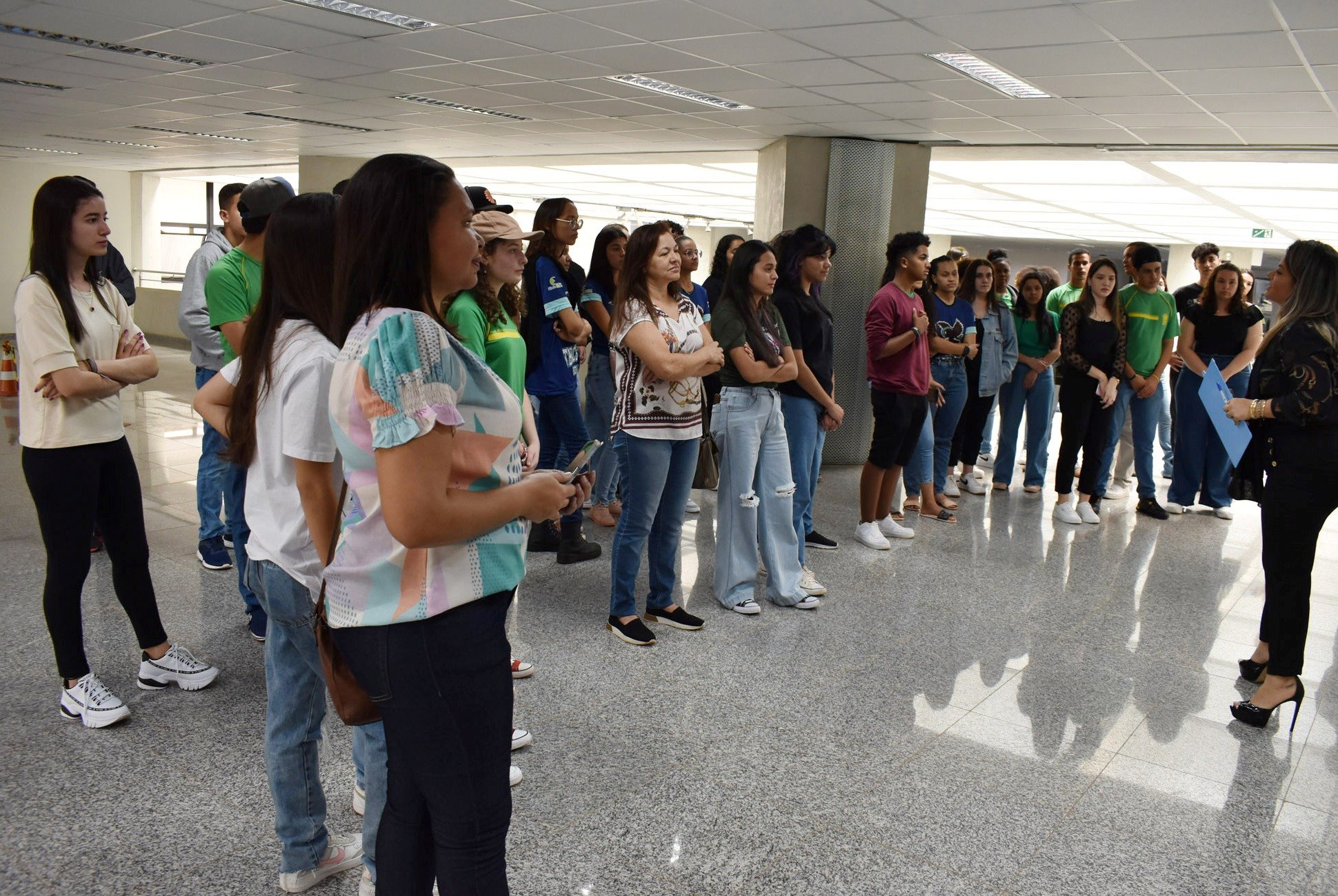 O Palácio Guaicurus, sede da Assembleia Legislativa do Mato Grosso do Sul (ALEMS), recebeu nesta segunda-feira (12), a visita de 86 pessoas, entre professores e estudantes da Escola Estadual Senador Filinto Müller, do município de Fátima do Sul-MS. Durante a visita institucional, os estudantes, que são do Ensino Médio e em sua maioria tem 16 anos, foram encaminhados pela equipe do Cerimonial para alguns pontos das dependências do Legislativo Estadual.